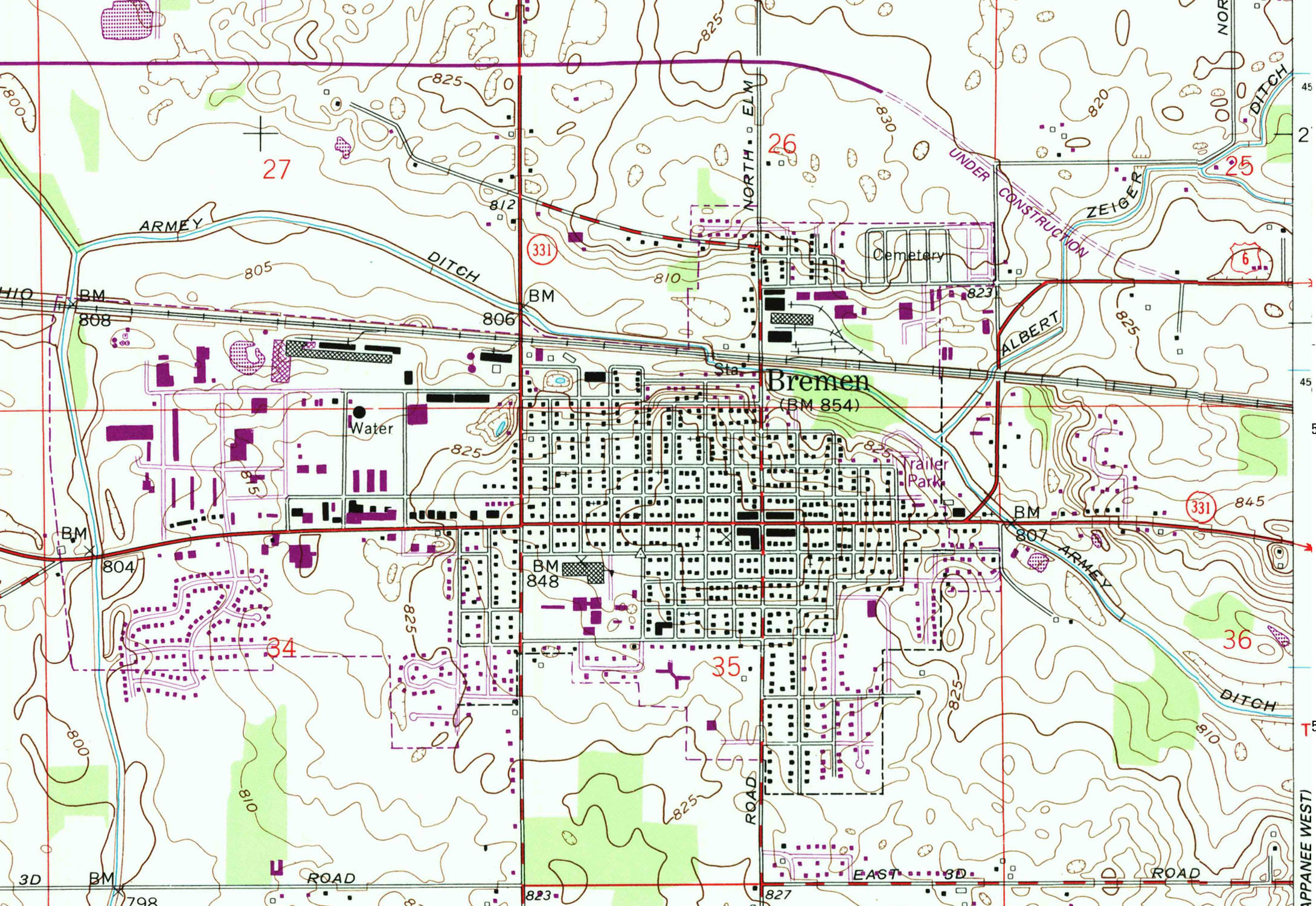 In his autobiography, Doc Bowen said that he had nothing to do with Bremen getting the US 6 highway by-pass or, for that matter, a state police post, and that he always looked askance at his gubernatorial staff when they brought him projects that happened to benefit his adopted home town for fear they were just trying to cull favors. Regardless, most residents felt (at the time) the by-pass was needed and gave credit to Doc when it came in 1987. This map shows the work in progress and other additions to the town (in purple) since the last update, which was in 1958.