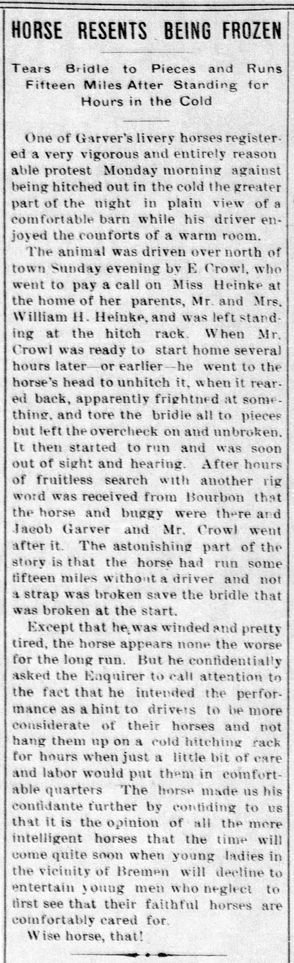 In this case, Miss Heinke—either Bertha or Nora—seems to have followed the horse’s advice and given Mr Crowl (or more likely Crowel) the brush off. Bertha married Louis Niemeyer in 1912 and moved to Fort Wayne and Nora married Dr William T Coburn in 1918 and moved to New York.