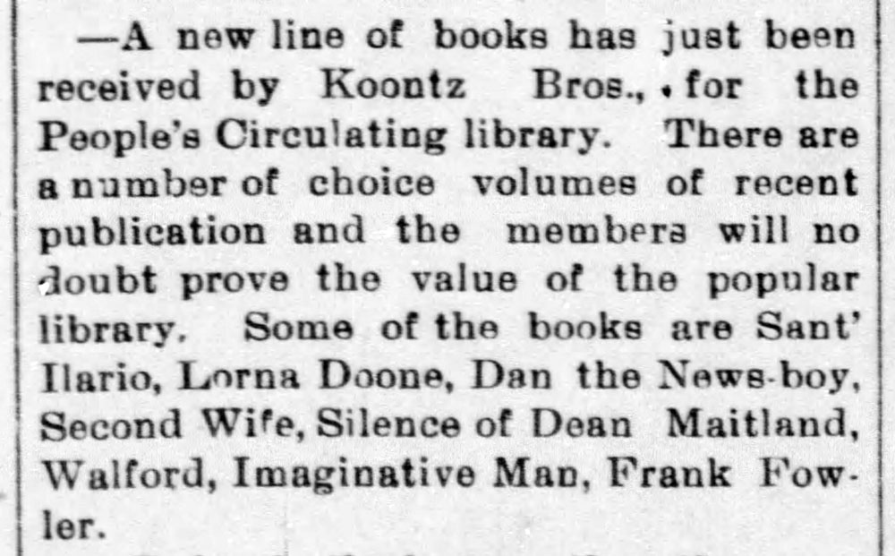 Before the town of Bremen had a proper library (which was established in the town hall in the 1920s before a proper library building was built in the 1950s), it had the People’s Circulating Library, run by the Koontz brothers, Frank and Charles, who also ran a drug store and who would, in 1899, establish a telephone system in Bremen.