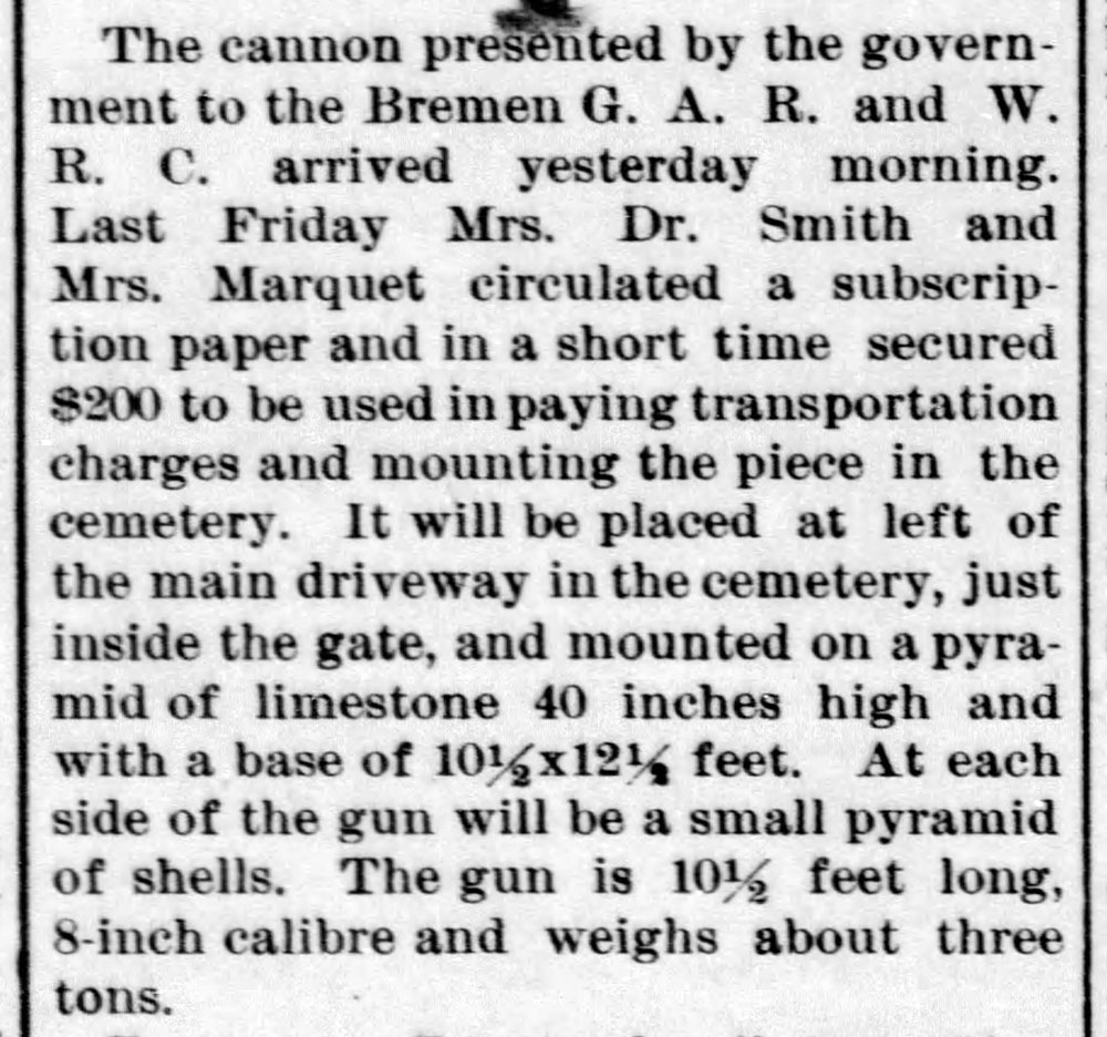 Through the efforts of Bremen’s Grand Army of the Republic post (Civil War vets), led by Ben Shaffer, Bremen got its cannon for the cemetery in 1902.