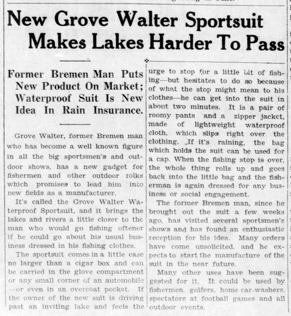 1937, he invented a waterproof “sportsuit” for the impulsive fisherman. Alas, it appears never to have been patented, so there are no images. It’s unclear how this suit would differ from chest waders, which had been invented many years earlier but wouldn’t be perfected until World War 2.