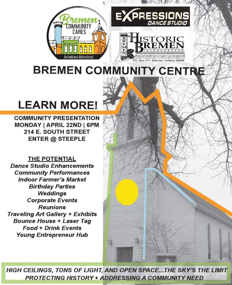 Bremen Community Cares and Historic Bremen, along with Expressions Dance Studio, invite you to come to the old Lutheran church at 214 E South St on April 22, 2019, at 6 PM for a discussion of saving and renovating the 1875 structure as a community event venue.