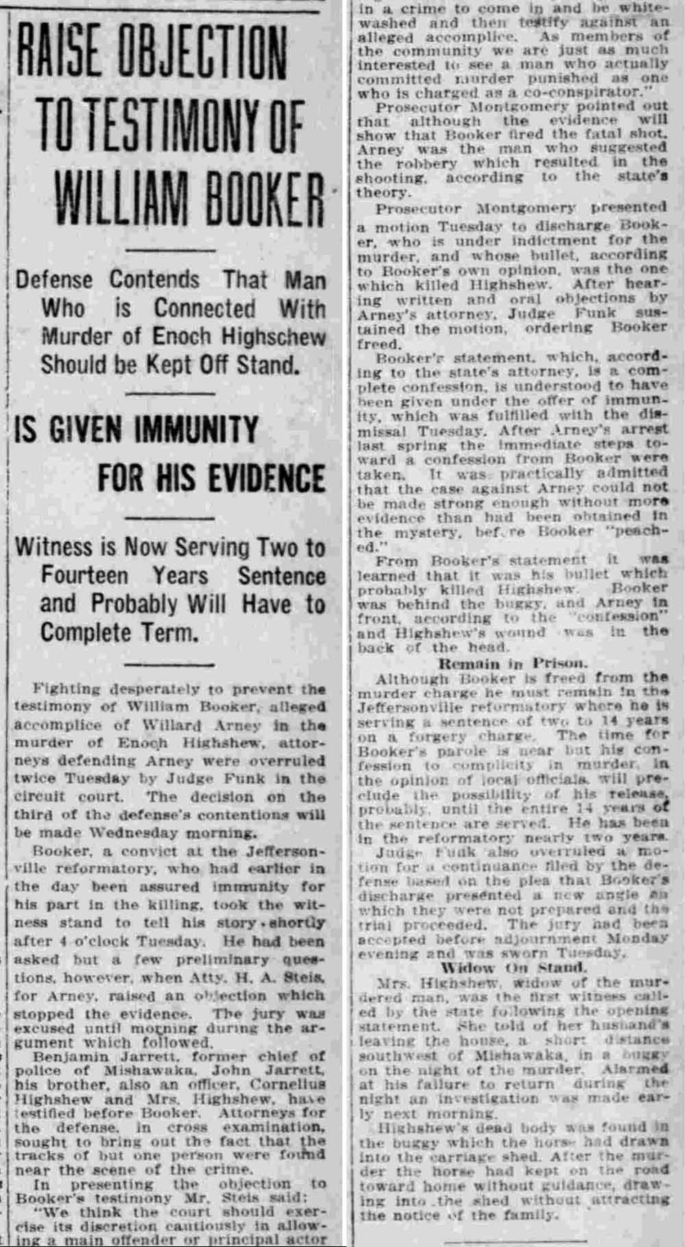 For years, the case went cold. Then, in 1913, somebody who knew something started talking: the teenage sister-in-law of Willard Armey said he’d told her he’d had a part in a killing back in 1909, when she was 14. When she happened to encounter the widow four years later, she—and the whole Mishawaka gossip machine—starting talking. The accomplice, William Booker—already in prison for another offense—quickly made his plea for immunity.