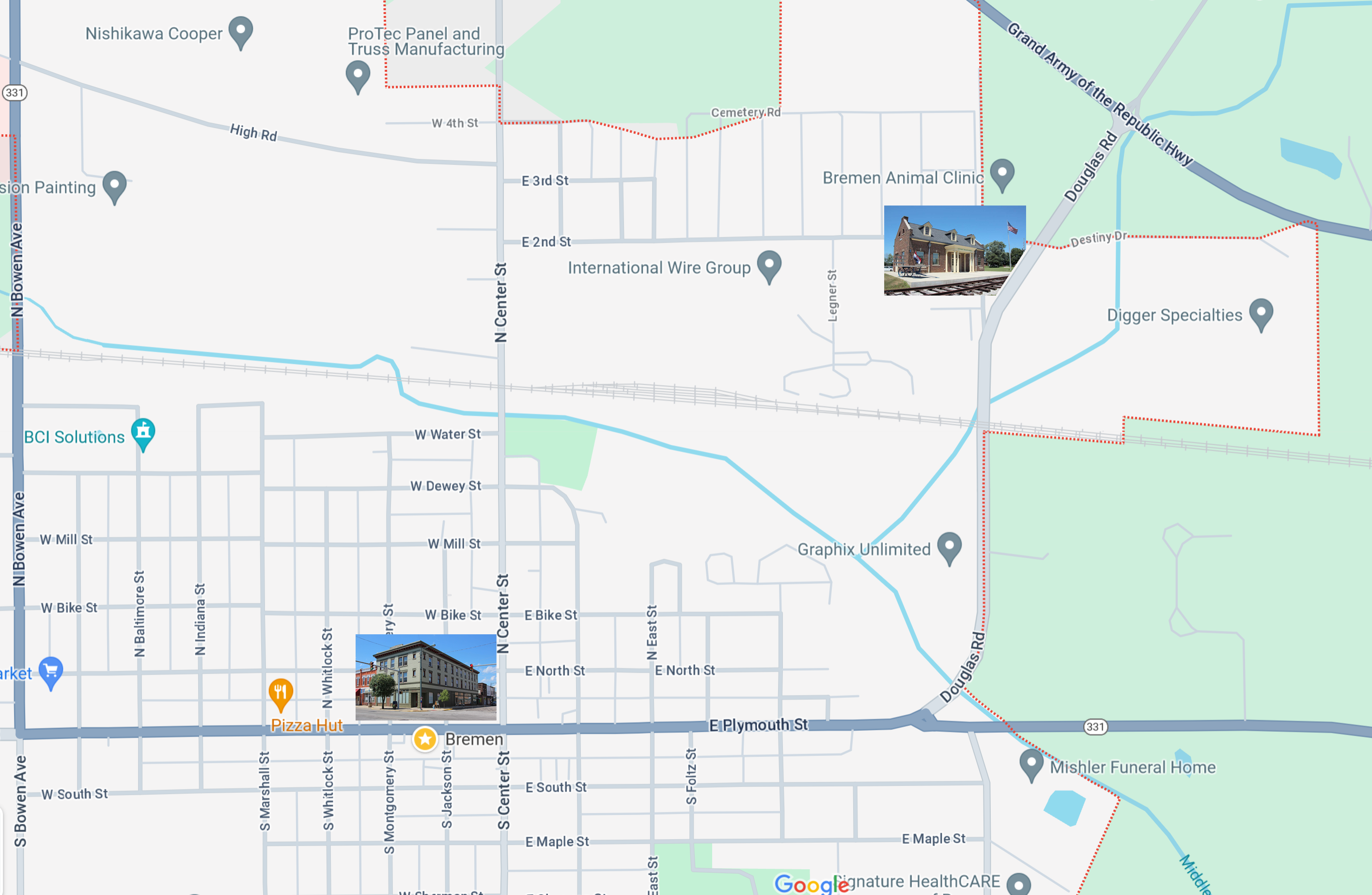 The history center is located at 111 N. Center St. in Bremen, Indiana. The depot is located on the northeast side of Bremen on Douglas road.