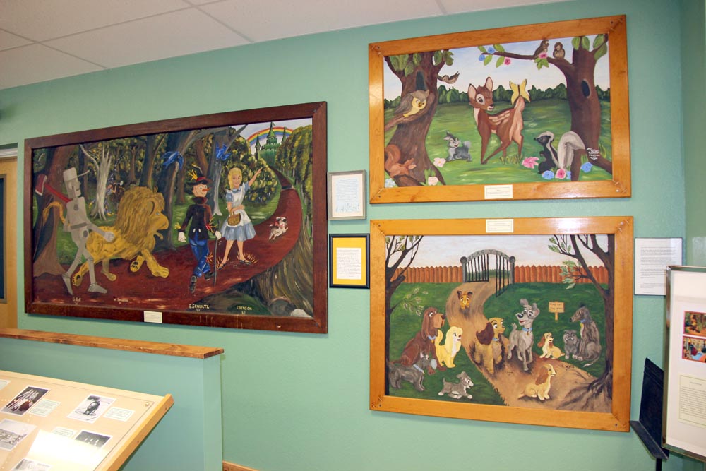 The building (which is owned by the Town of Bremen) also has meeting rooms available for community events, accessible from the old bank entrance at the corner of Plymouth and Center and through the History Center itself. The History Center makes use of these for our History Chat events. The meeting rooms are decorated in part with the popular movie murals painted by Bremen High School students in the 1950s and ’60s.